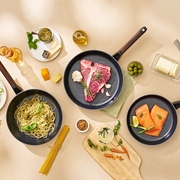 The Happycall Royal Series 3-piece set is the ultimate kitchen upgrade, covering every cooking need with professional performance. This comprehensive set includes a nimble 24cm frypan for breakfast, a deep 26cm wok for stir-fries, and a spacious 28cm frypan for large family meals.