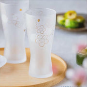 This frosted beer glass from Aderia is decorated with soft pink-gold sakura blossoms and heart-shaped petals, combining modern glassmaking with seasonal Japanese motifs. The gentle curves of the glass taper toward the centre, encouraging a smooth pour and a balanced grip.