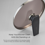 - Anti-Overflow Self-Standing Lids: Both tempered glass lids feature a unique handle that allows them to stand upright, and an automatic steam vent that reduces overflows.