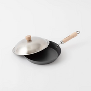 The pan undergoes a special nitriding heat treatment, creating a hard, rust-resistant surface ready for seasoning. This professional-grade tool is available as a standalone pan or as a set with a matching stainless steel lid.