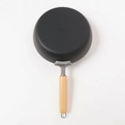 The pan's tall, straight walls provide extra depth, allowing for easier stirring and flipping without spillage. Its flat base ensures stability and optimal performance on all stovetops, including induction, while the natural wood handle provides a comfortable, cool grip. Its matte black finish and simple design are hallmarks of Japanese cookware culture.