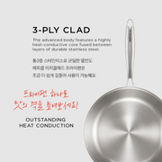 Embrace minimalist design and professional performance with the Happycall Stay series. This 28cm frypan is engineered with a full 3-ply clad body, featuring a fast-heating core between two layers of high-purity stainless steel. Its classic sloped sides and flat cooking surface are perfect for searing, frying, and flipping, offering incredible control and lasting quality for any home cook.