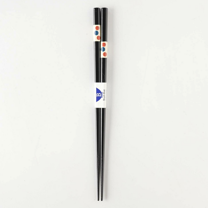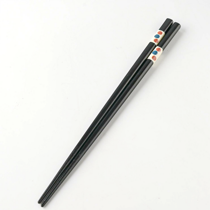 Finished in glossy black lacquer, these 'Tenuchi' (hand-finished) style chopsticks feature a charming blue dotted pattern on a white band, inspired by 'Tonbo-dama' (dragonfly beads). The design adds a gentle, artistic touch to your table setting.