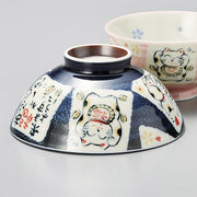 This Japanese bowl features the "Maneki Neko" or "Beckoning Cat", a common talisman believed to bring good luck and fortune in Japanese culture. The exterior is adorned with a vibrant, detailed pattern of lucky cats in various poses, alongside other symbols of good fortune like Daruma dolls.